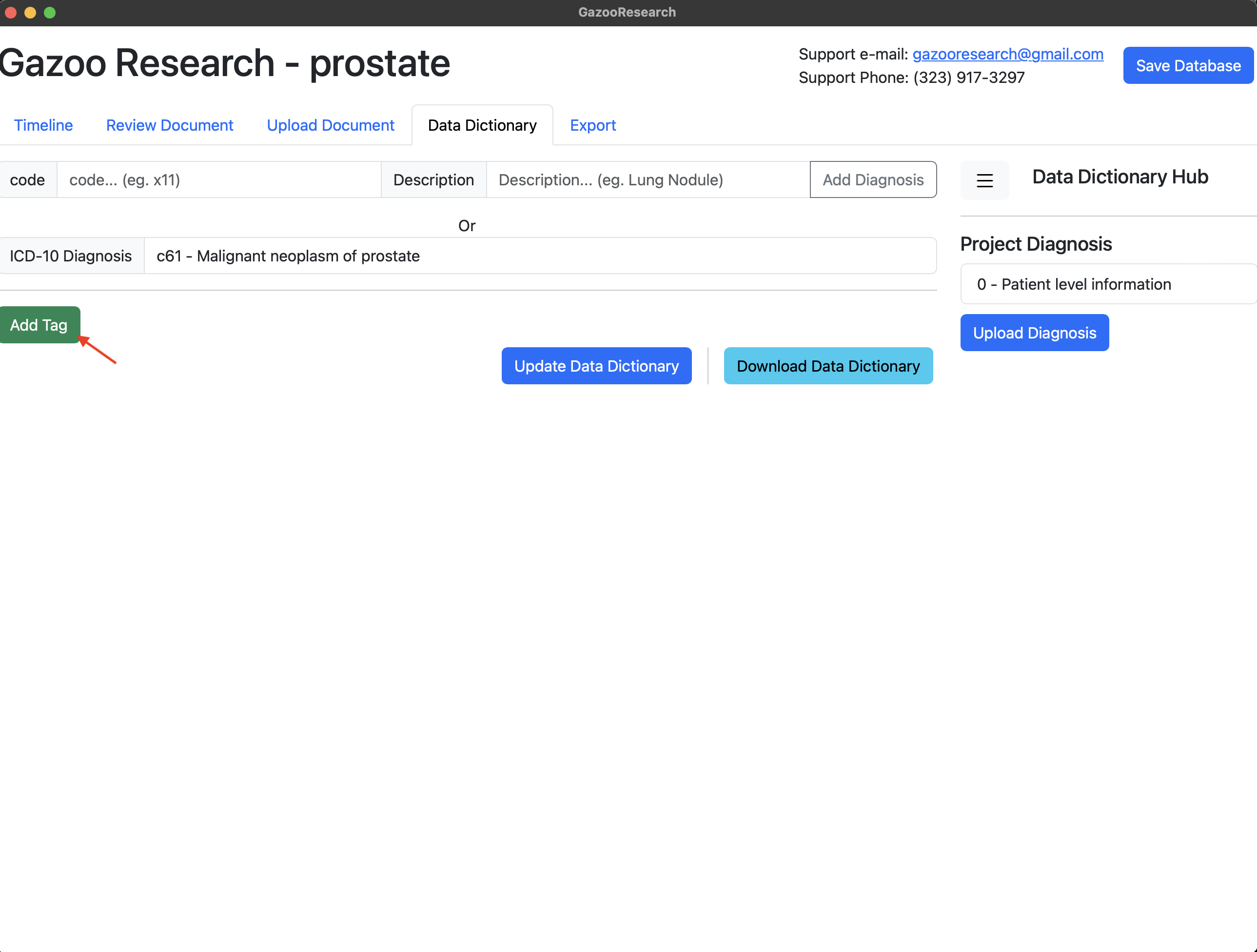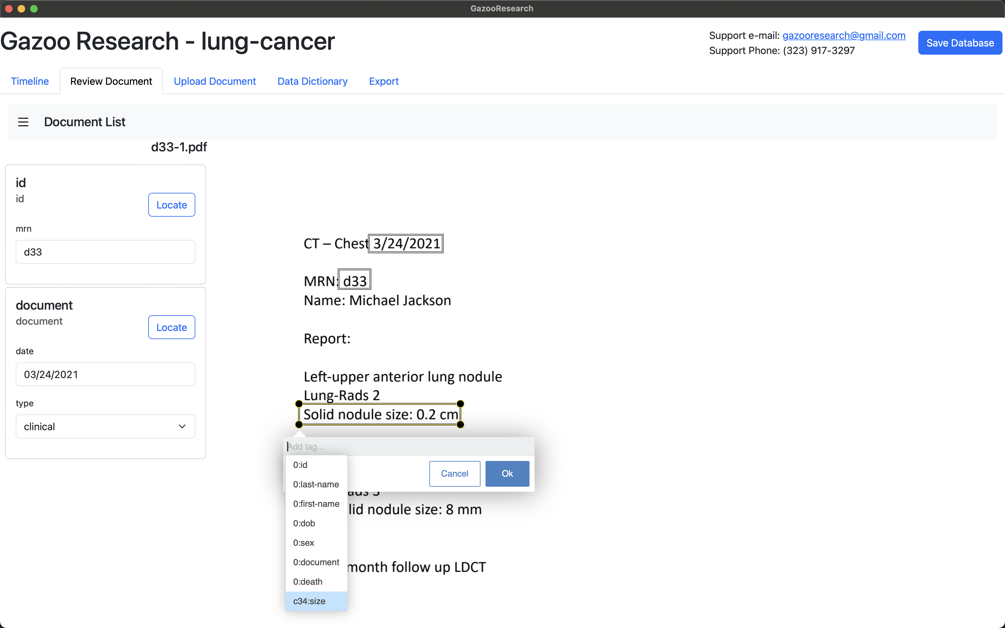 We'll create a data dictionary using the icd10 code: "c34 - Malignant neoplasm of the bronchus and lung". The tag will be named "size" indicating the size of the lung nodules. The tag's fields include 1) Date 2) Size 3) Units, 4) target-id.