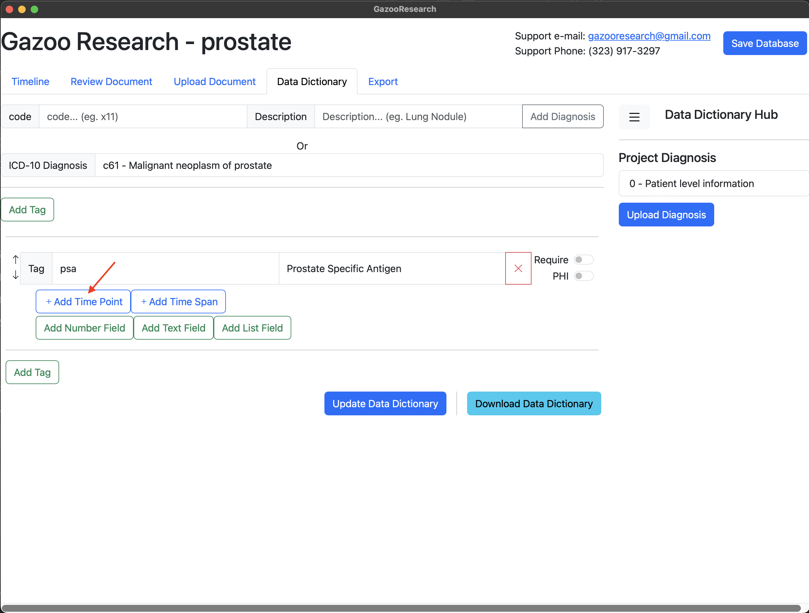 Next we want to add the fields for PSA. In the case of PSA the fields include 1) Date, 2) Value, and 3) Units. So first we will add the timepoint.