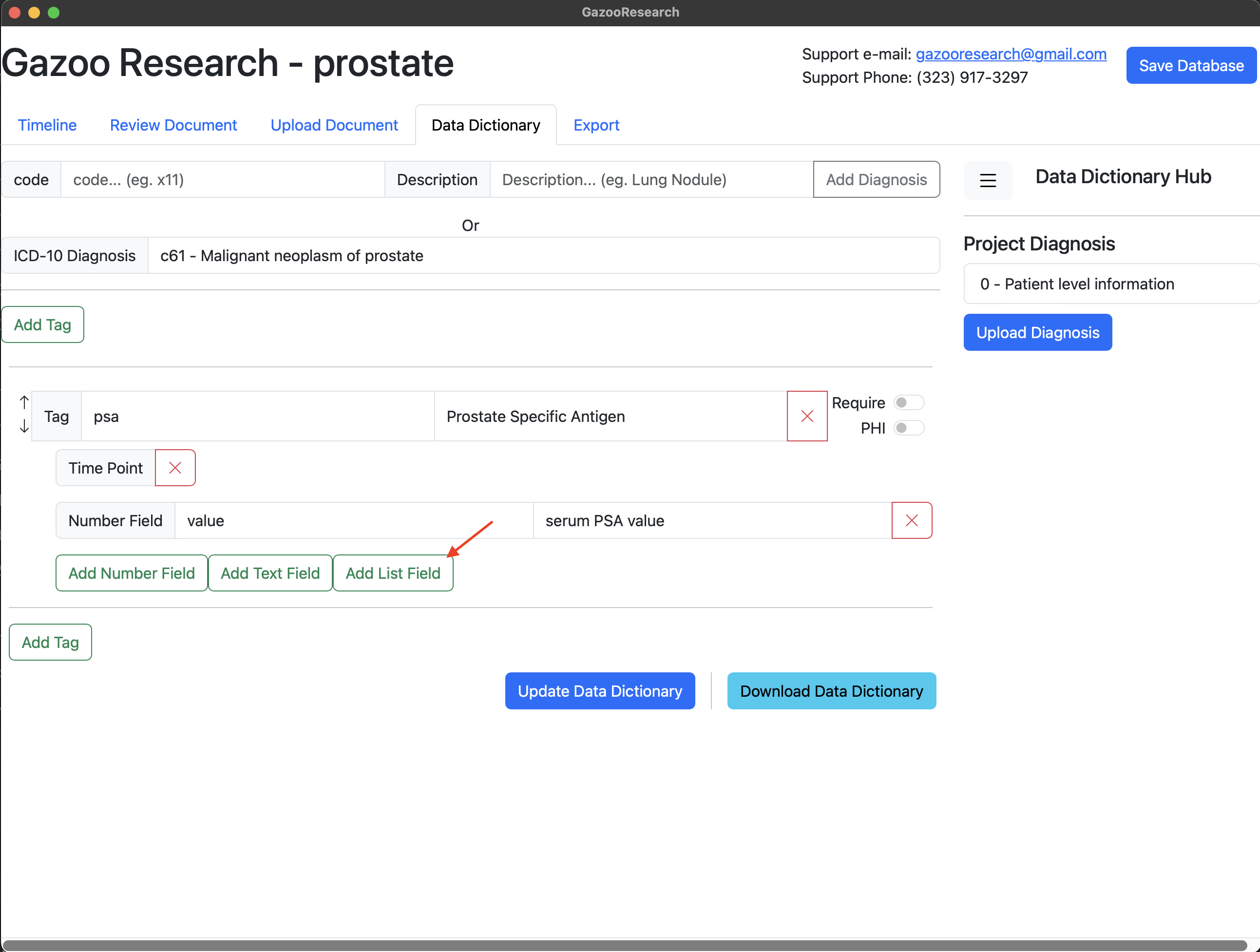 Lastly we'll add the units field. Note that different hospital may report PSA using different units (ng/ml, g/dL). Therefore units is a categorial variable, and can have one of two values, therefore we will use the "List Field" option.