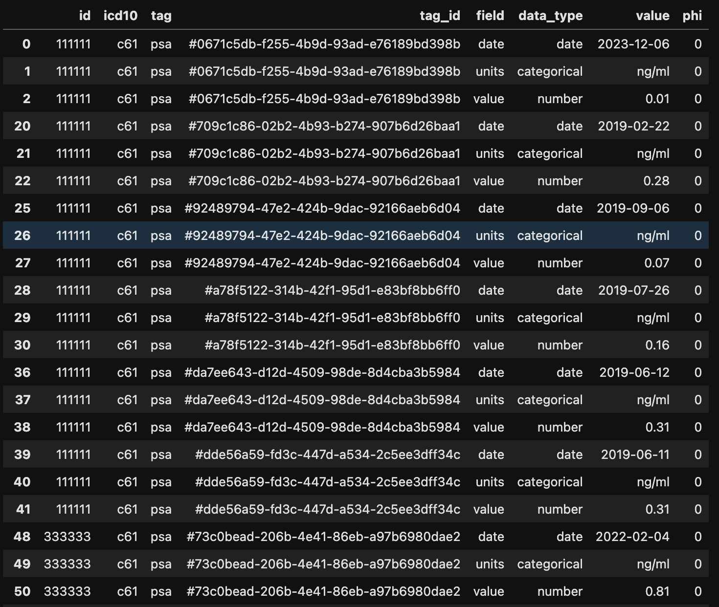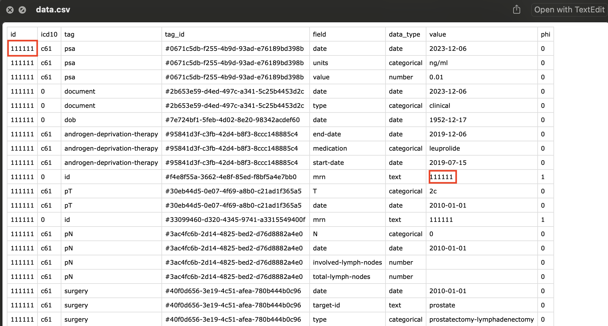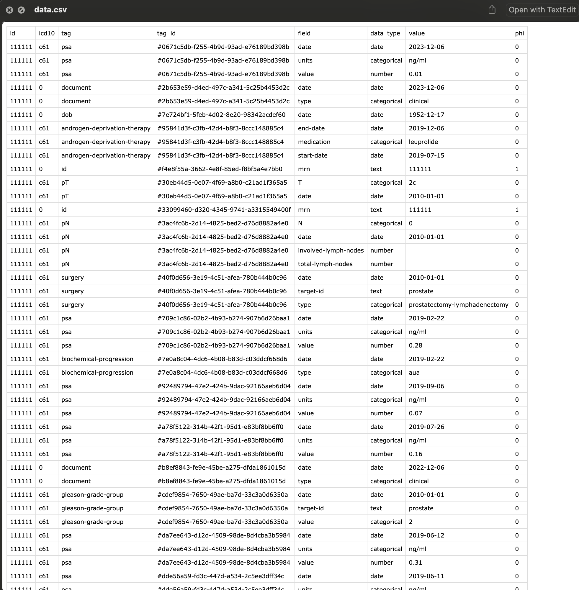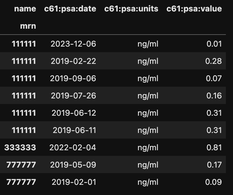 Note that now the column names are the data fields. For example, for mrn:111111, the date of biochemical progression is 2019-02-22.
