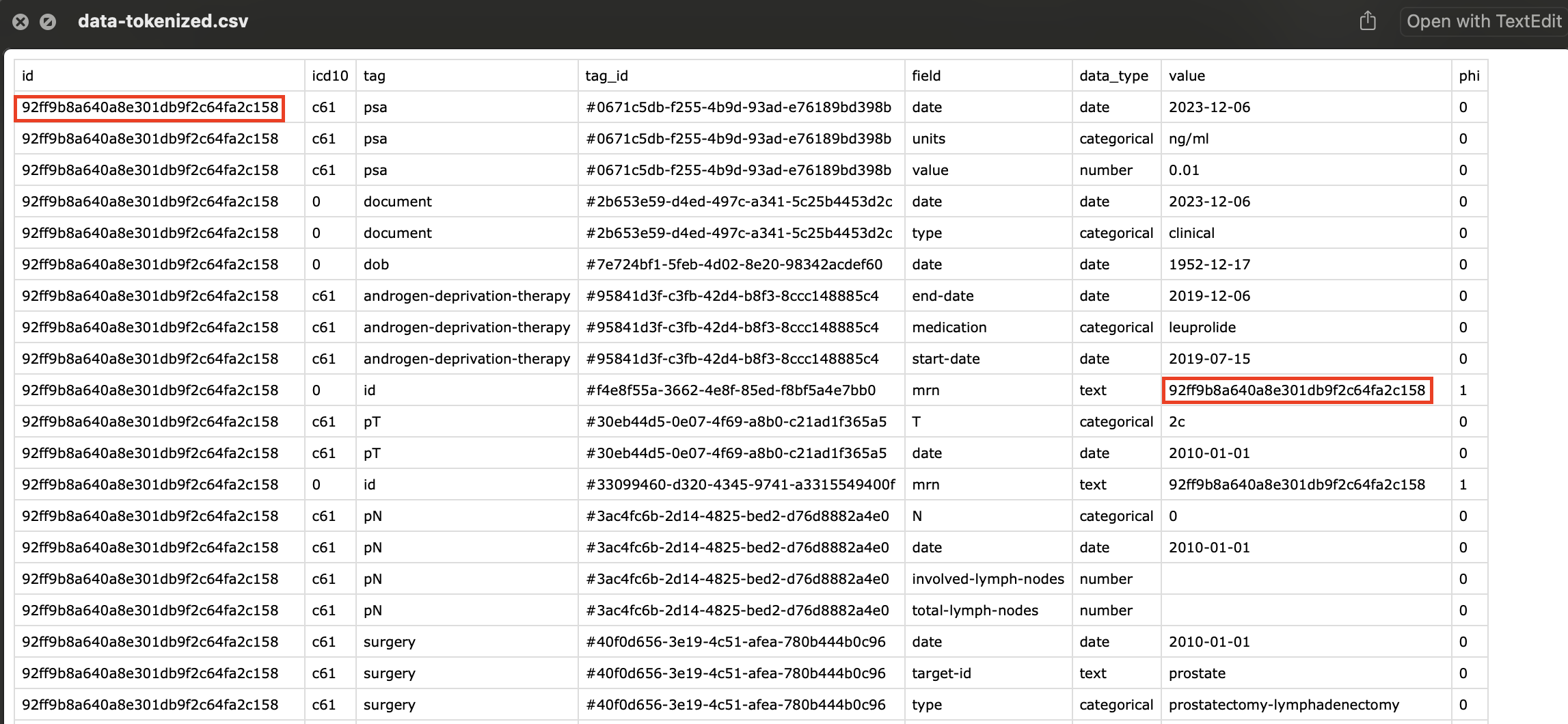 All the tags which were labelled as phi have been replaced with an incomprehensible string, preventing anybody from figuring out the original mrn.