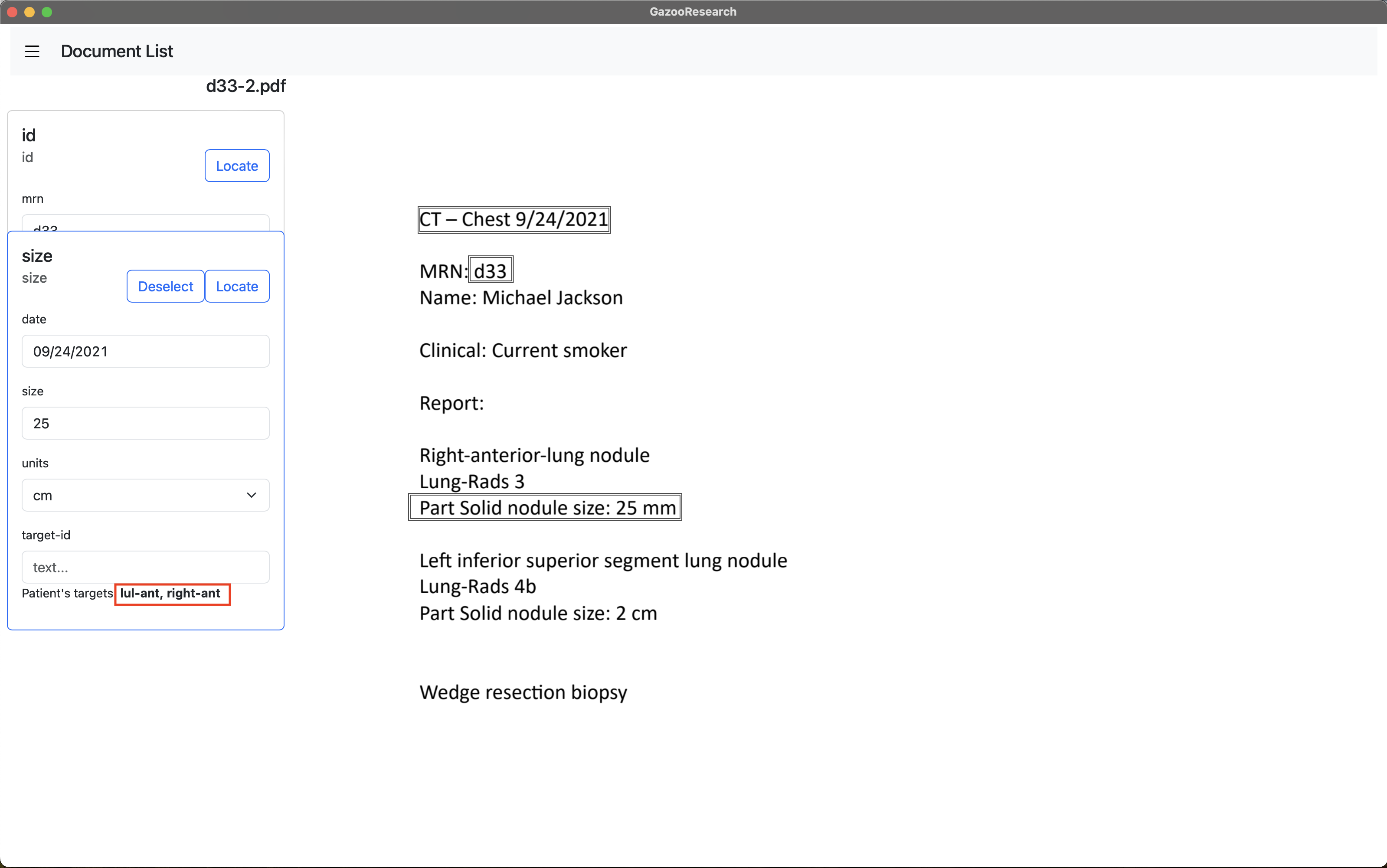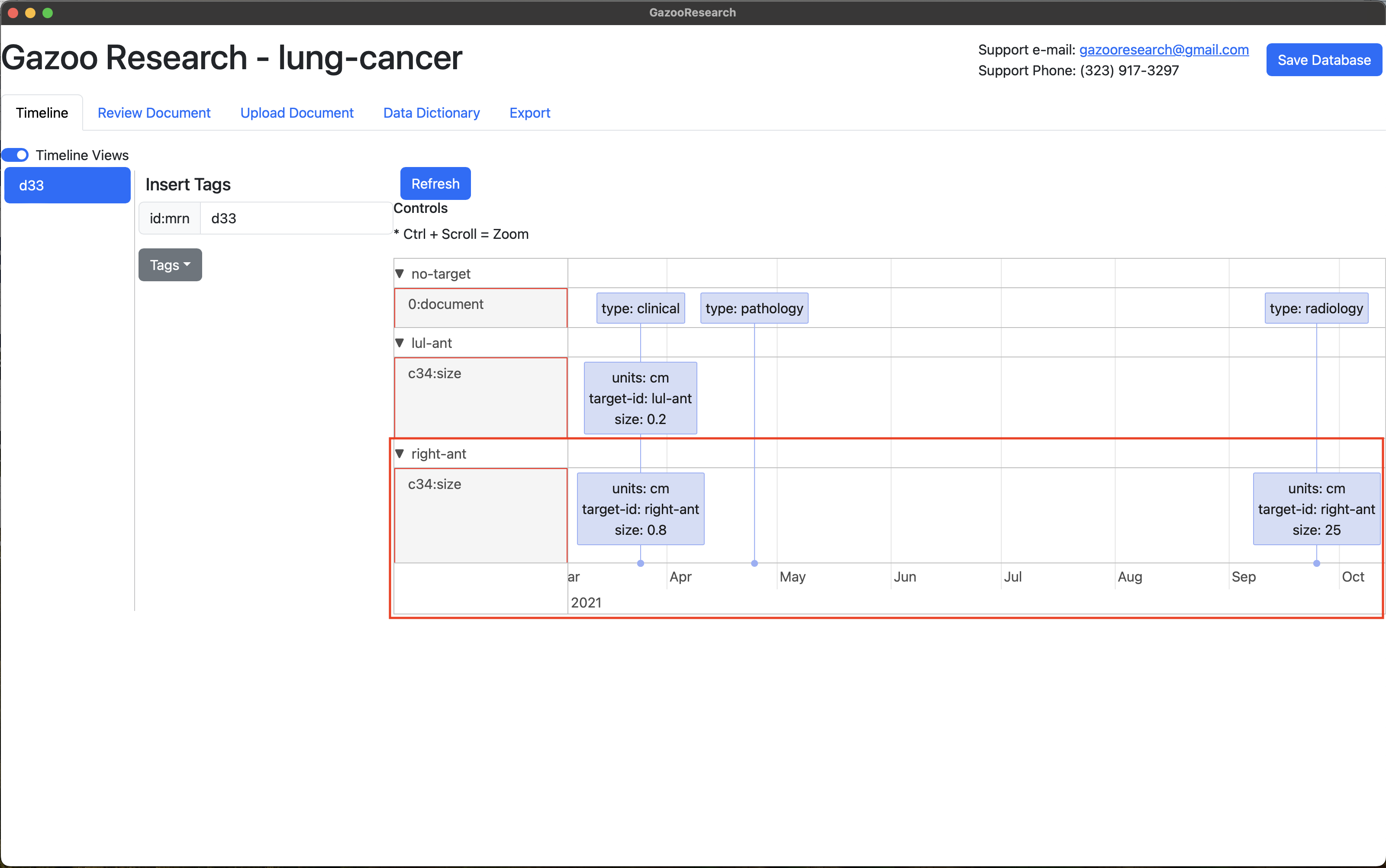 When you navigate to the Timeline's Tab. GazooResearch aggrigated target-ids together. You can see that this one lung metastasis grew over the 6 months.